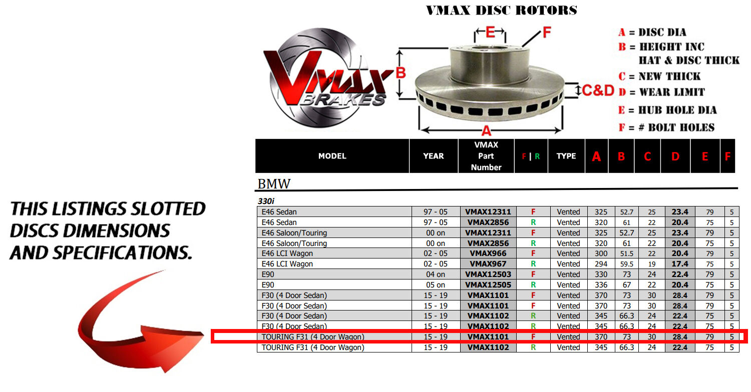 This sale is for a new pair (2 disc rotors) of Genuine VMAX Dimple Drilled & Slotted Performance Front Disc Brake Rotors and a matching Front set of brake pads to suit BMW 330i TOURING F31 (4 Door Wagon) models built 2015 till 2019 and are a direct replacement item.