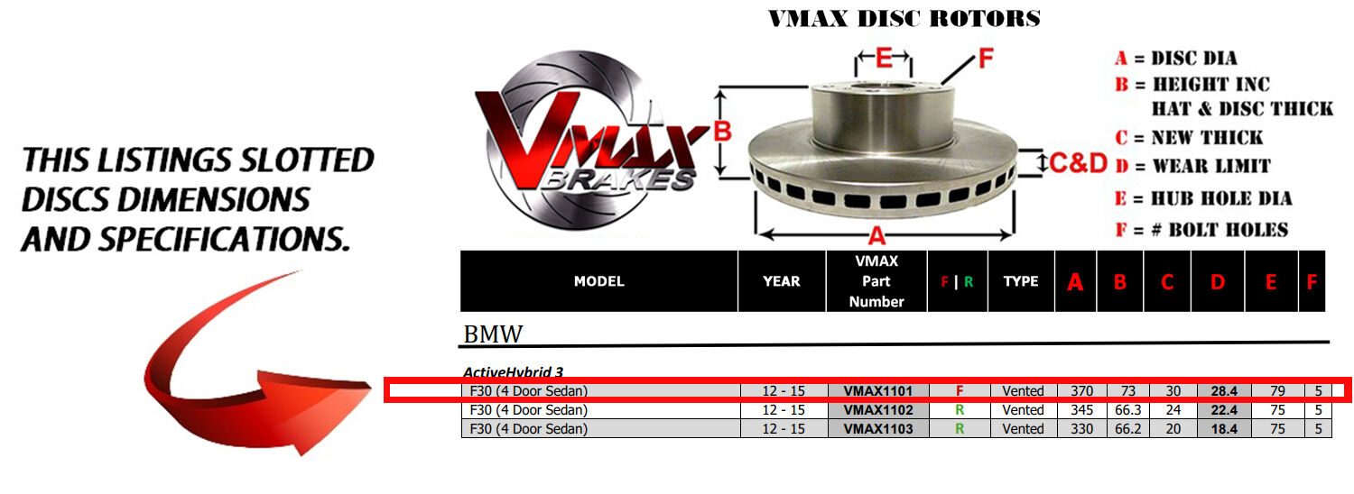 This sale is for a new pair (2 disc rotors) of Genuine VMAX Dimple Drilled & Slotted Performance Front Disc Brake Rotors and a matching Front set of brake pads to suit BMW ActiveHybrid 3 F30 (4 Door Sedan) models built 2012 till 2015 and are a direct replacement item.