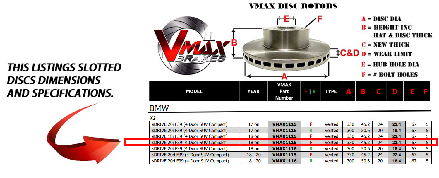 This sale is for a new pair (2 disc rotors) of Genuine VMAX Dimple Drilled & Slotted Performance Front Disc Brake Rotors and a matching Front set of brake pads to suit BMW X2 sDRIVE 20i F39 (4 Door SUV Compact) models built 2018 Onwards and are a direct replacement item.