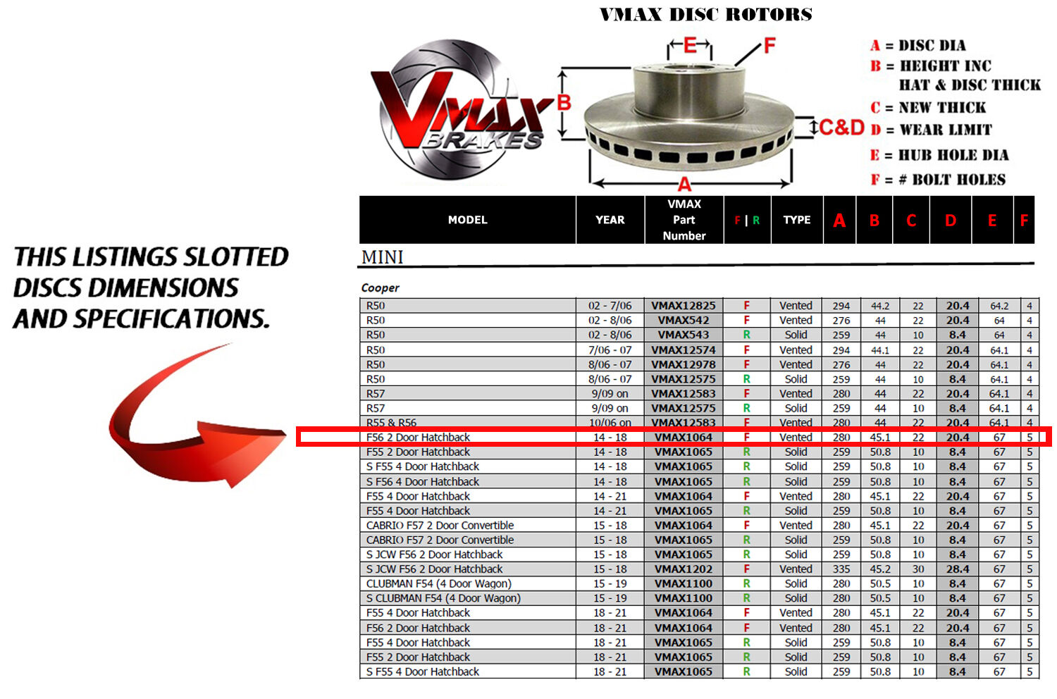 This sale is for a new pair (2 disc rotors) of Genuine VMAX Dimple Drilled & Slotted Performance Front Disc Brake Rotors and a matching Front set of brake pads to suit MINI Cooper F56 2 Door Hatchback models built 2014 till 2018 and are a direct replacement item.