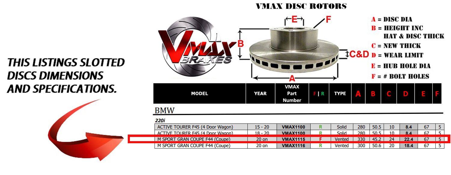 This sale is for a new pair (2 disc rotors) of Genuine VMAX Dimple Drilled & Slotted Performance Front Disc Brake Rotors to suit BMW 220i M SPORT GRAN COUPE F44 (Coupe) models built 2020 Onwards and are a direct replacement item.