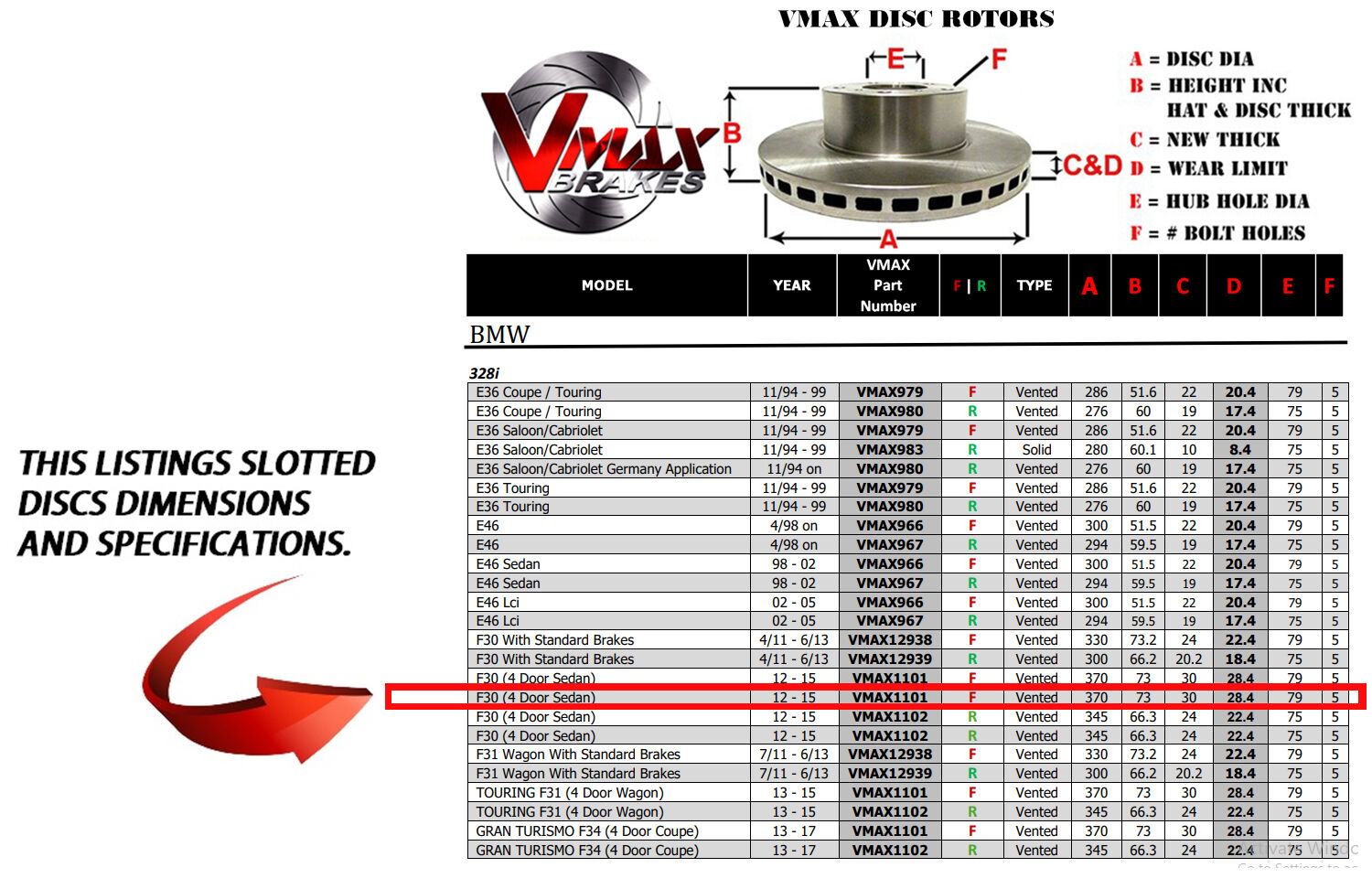 This sale is for a new pair (2 disc rotors) of Genuine VMAX Dimple Drilled & Slotted Performance Front Disc Brake Rotors to suit BMW 328i F30 (4 Door Sedan) models built 2012 till 2015 and are a direct replacement item.