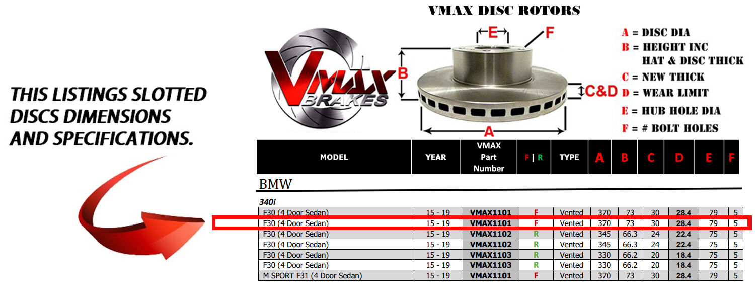 This sale is for a new pair (2 disc rotors) of Genuine VMAX Dimple Drilled & Slotted Performance Front Disc Brake Rotors to suit BMW 340i F30 (4 Door Sedan) models built 2015 till 2019 and are a direct replacement item.