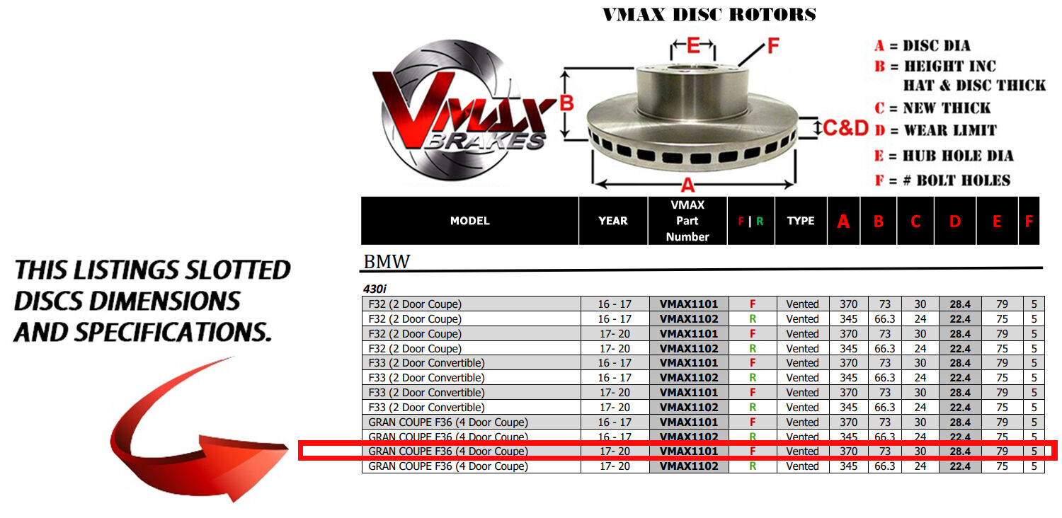 This sale is for a new pair (2 disc rotors) of Genuine VMAX Dimple Drilled & Slotted Performance Front Disc Brake Rotors to suit BMW 430i GRAN COUPE F36 (4 Door Coupe) models built 2017 till 2020 and are a direct replacement item.