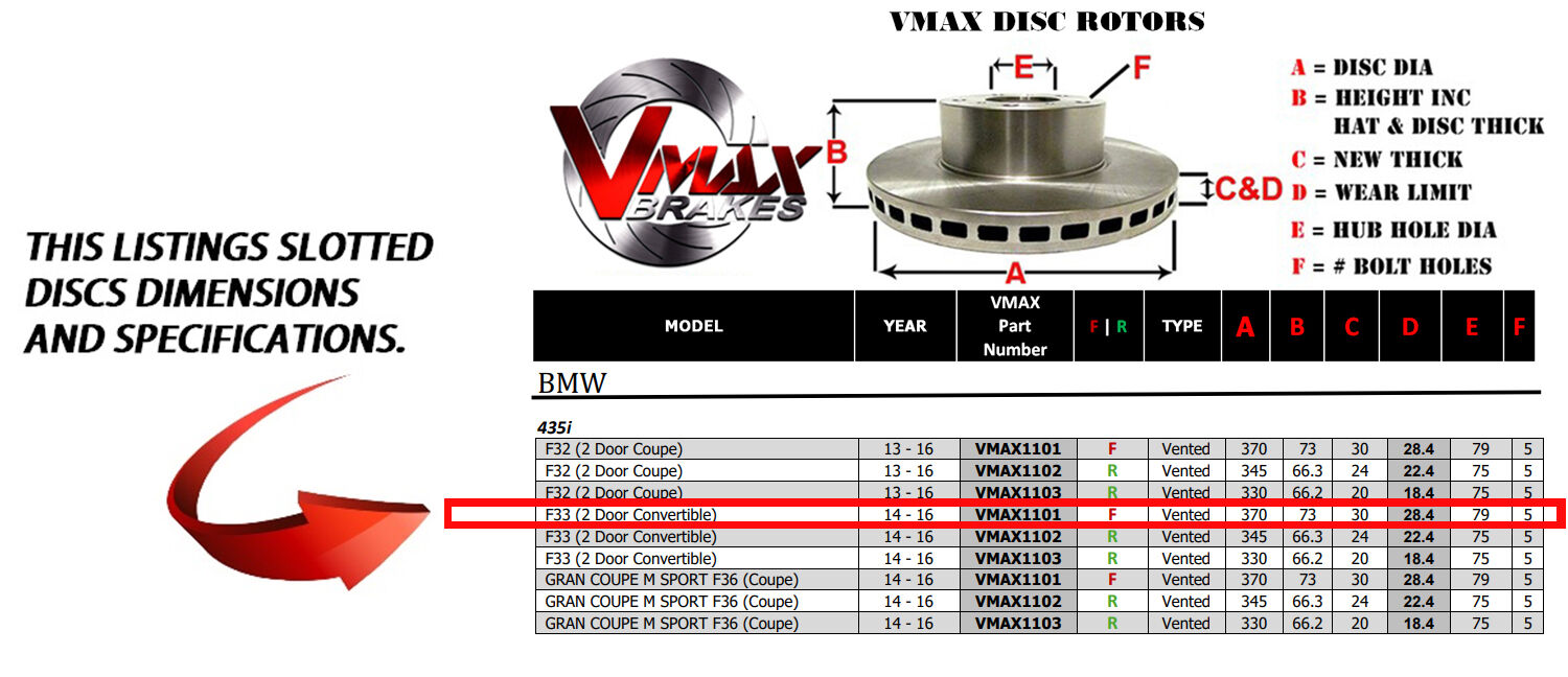 This sale is for a new pair (2 disc rotors) of Genuine VMAX Dimple Drilled & Slotted Performance Front Disc Brake Rotors to suit BMW 435i F33 (2 Door Convertible) models built 2014 till 2016 and are a direct replacement item.
