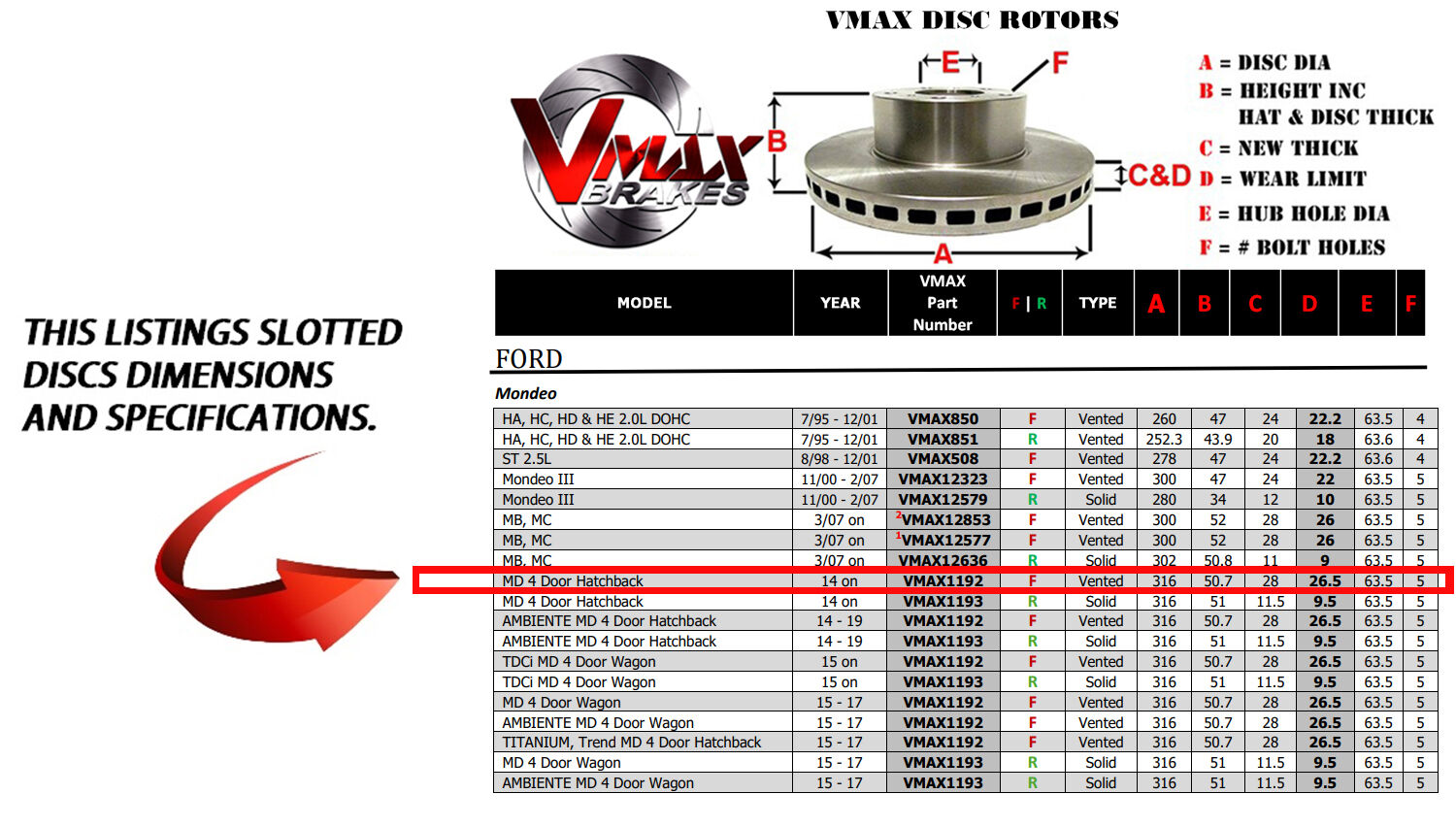 This sale is for a new pair (2 disc rotors) of Genuine VMAX Dimple Drilled & Slotted Performance Front Disc Brake Rotors to suit FORD Mondeo MD 4 Door Hatchback models built 2014 Onwards and are a direct replacement item.
