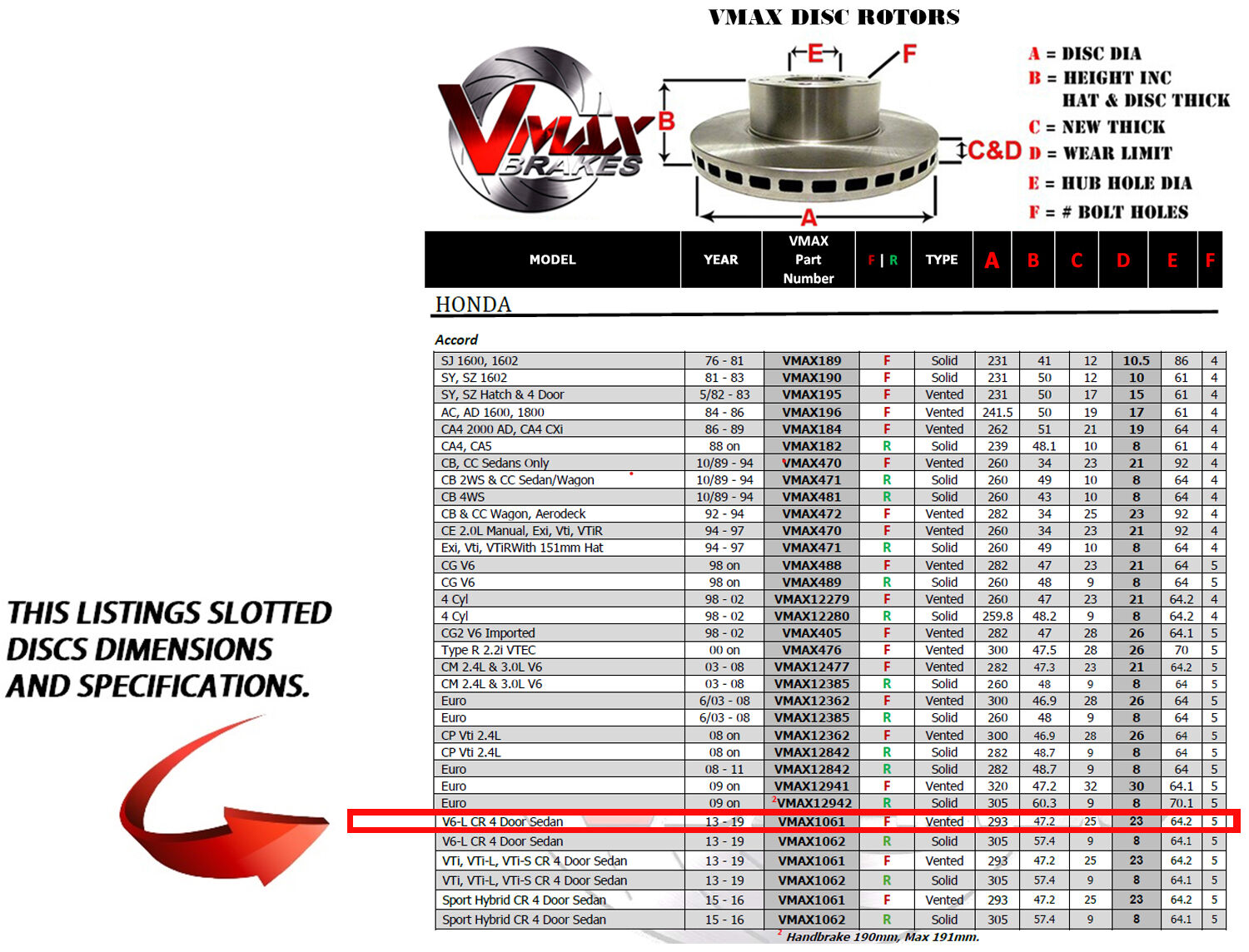 This sale is for a new pair (2 disc rotors) of Genuine VMAX Dimple Drilled & Slotted Performance Front Disc Brake Rotors to suit HONDA Accord V6-L CR 4 Door Sedan models built 2013 till 2019 and are a direct replacement item.