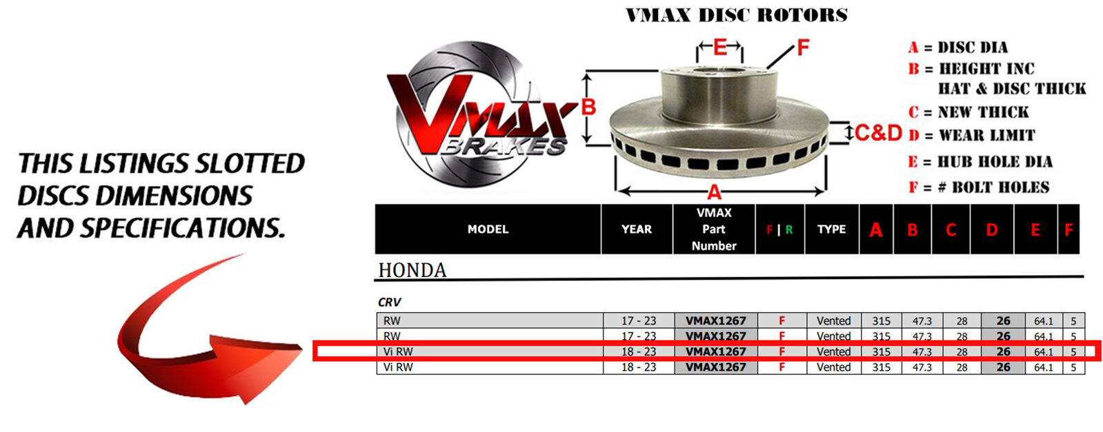 This sale is for a new pair (2 disc rotors) of Genuine VMAX Dimple Drilled & Slotted Performance Front disc brake rotors to suit HONDA CRV Vi RW models built 2018-2023 and are a direct replacement item.
