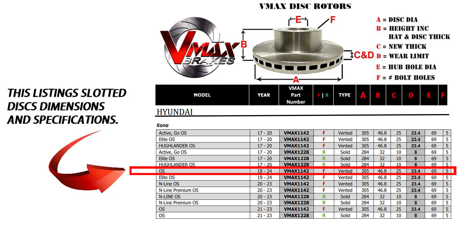 This sale is for a new pair (2 disc rotors) of Genuine VMAX Dimple Drilled & Slotted Performance Front Disc Brake Rotors to suit HYUNDAI Kona OS models built 2018 till 2024 and are a direct replacement item.