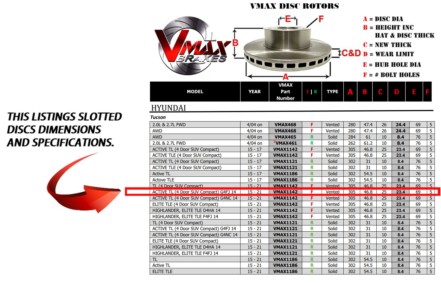 This sale is for a new pair (2 disc rotors) of Genuine VMAX Dimple Drilled & Slotted Performance Front Disc Brake Rotors to suit HYUNDAI Tucson ACTIVE TL (4 Door SUV Compact) G4FJ 14 models built 2015 till 2021 and are a direct replacement item.