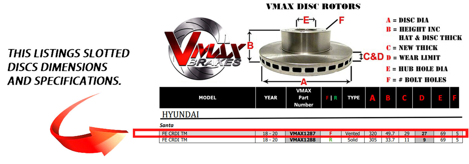 This sale is for a new pair (2 disc rotors) of Genuine VMAX Dimple Drilled & Slotted Performance Front disc brake rotors to suit HYUNDAI Santa FE CRDI TM models built 2018-2020 and are a direct replacement item.