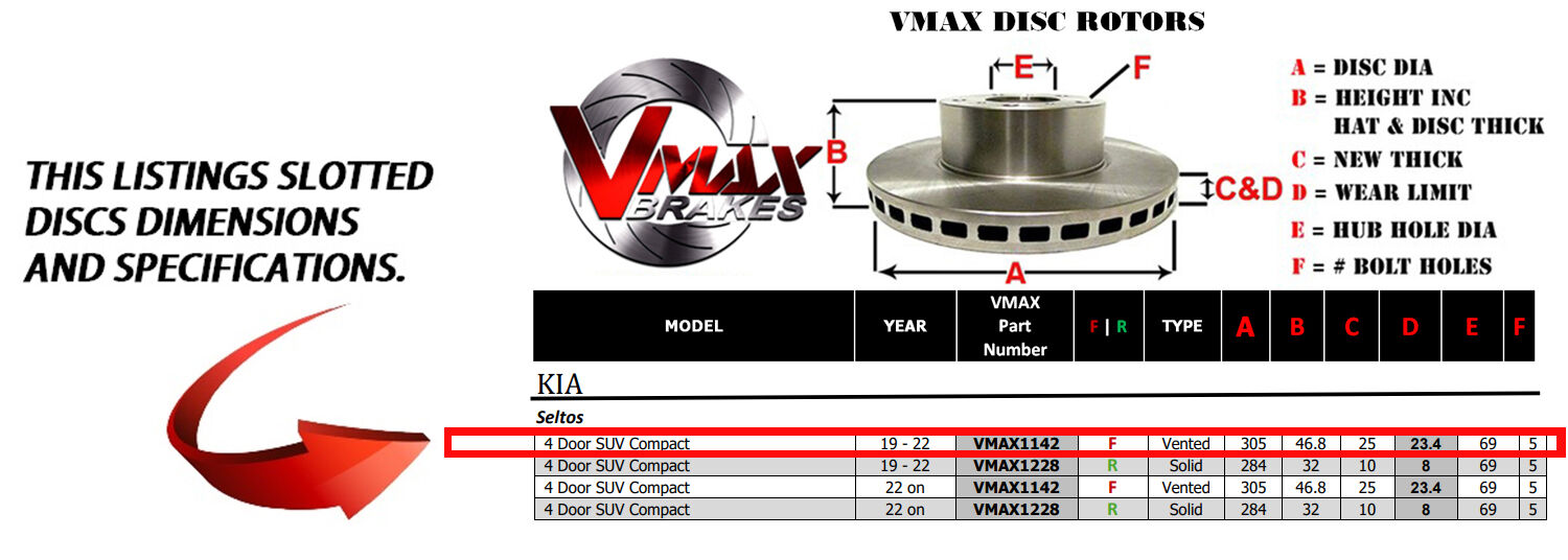 This sale is for a new pair (2 disc rotors) of Genuine VMAX Dimple Drilled & Slotted Performance Front Disc Brake Rotors to suit KIA Seltos 4 Door SUV Compact models built 2019 till 2022 and are a direct replacement item.