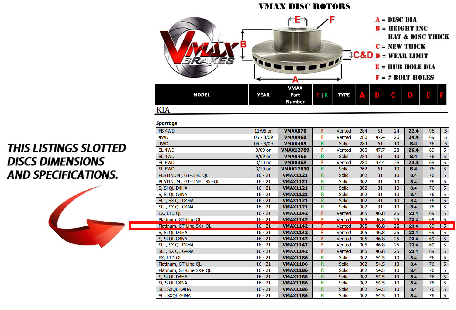 This sale is for a new pair (2 disc rotors) of Genuine VMAX Dimple Drilled & Slotted Performance Front Disc Brake Rotors to suit KIA Sportage Platinum, GT-Line SX+ QL models built 2016 till 2021 and are a direct replacement item.