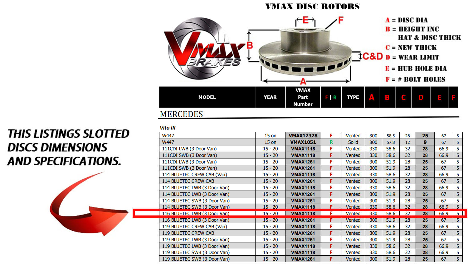This sale is for a new pair (2 disc rotors) of Genuine VMAX Dimple Drilled & Slotted Performance Front Disc Brake Rotors to suit MERCEDES Vito III 116 BLUETEC LWB (3 Door Van) models built 2015 till 2020 and are a direct replacement item.