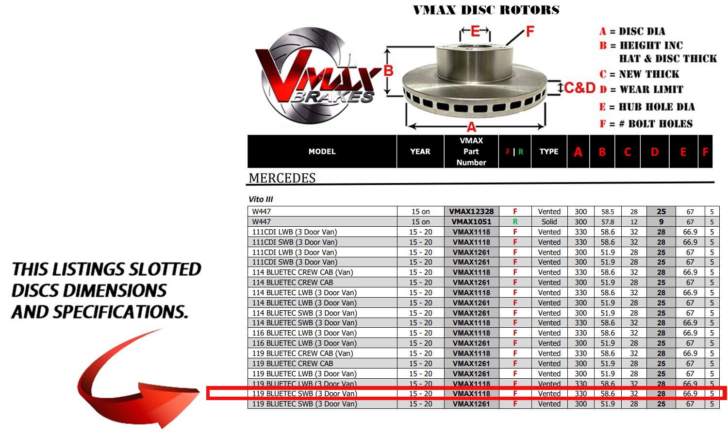 This sale is for a new pair (2 disc rotors) of Genuine VMAX Dimple Drilled & Slotted Performance Front Disc Brake Rotors to suit MERCEDES Vito III 119 BLUETEC SWB (3 Door Van) models built 2015 till 2020 and are a direct replacement item.
