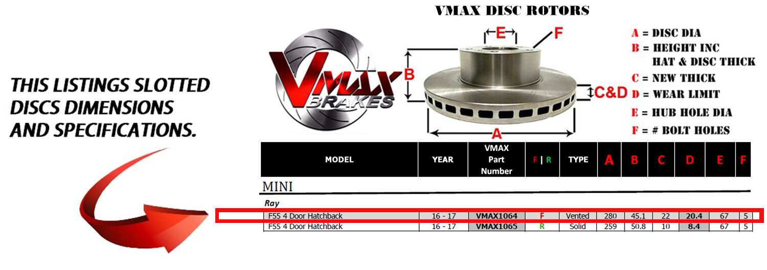 This sale is for a new pair (2 disc rotors) of Genuine VMAX Dimple Drilled & Slotted Performance Front Disc Brake Rotors to suit MINI Ray F55 4 Door Hatchback models built 2016 till 2017 and are a direct replacement item.