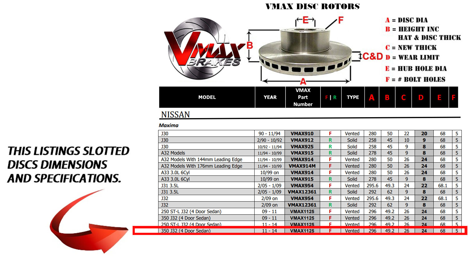 This sale is for a new pair (2 disc rotors) of Genuine VMAX Dimple Drilled & Slotted Performance Front Disc Brake Rotors to suit NISSAN Maxima 350 J32 (4 Door Sedan) models built 2011 till 2014 and are a direct replacement item.
