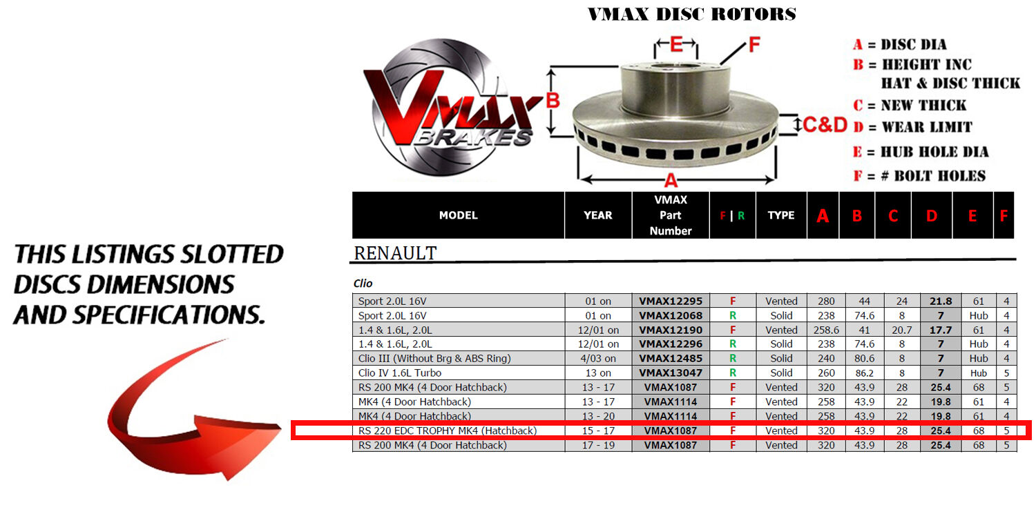 This sale is for a new pair (2 disc rotors) of Genuine VMAX Dimple Drilled & Slotted Performance Front Disc Brake Rotors to suit RENAULT Clio RS 220 EDC TROPHY MK4 (Hatchback) models built 2015 till 2017 and are a direct replacement item.