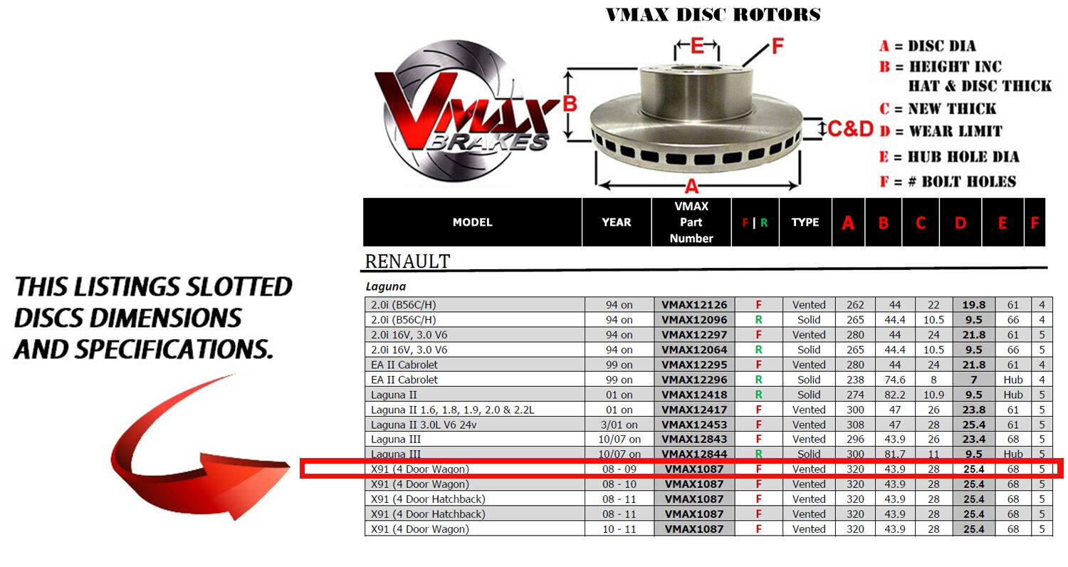 This sale is for a new pair (2 disc rotors) of Genuine VMAX Dimple Drilled & Slotted Performance Front Disc Brake Rotors to suit RENAULT Laguna X91 (4 Door Wagon) models built 2008 till 2009 and are a direct replacement item.