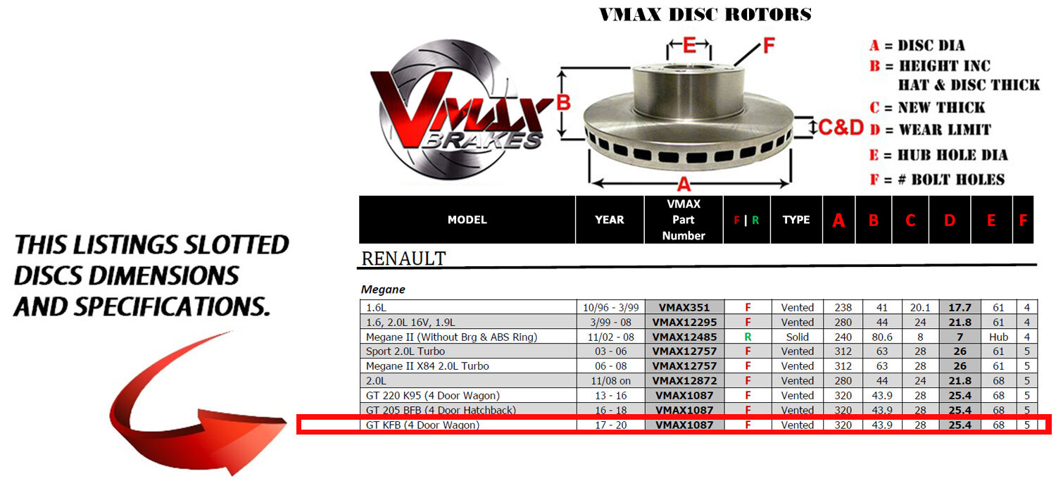 This sale is for a new pair (2 disc rotors) of Genuine VMAX Dimple Drilled & Slotted Performance Front Disc Brake Rotors to suit RENAULT Megane GT KFB (4 Door Wagon) models built 2017 till 2020 and are a direct replacement item.