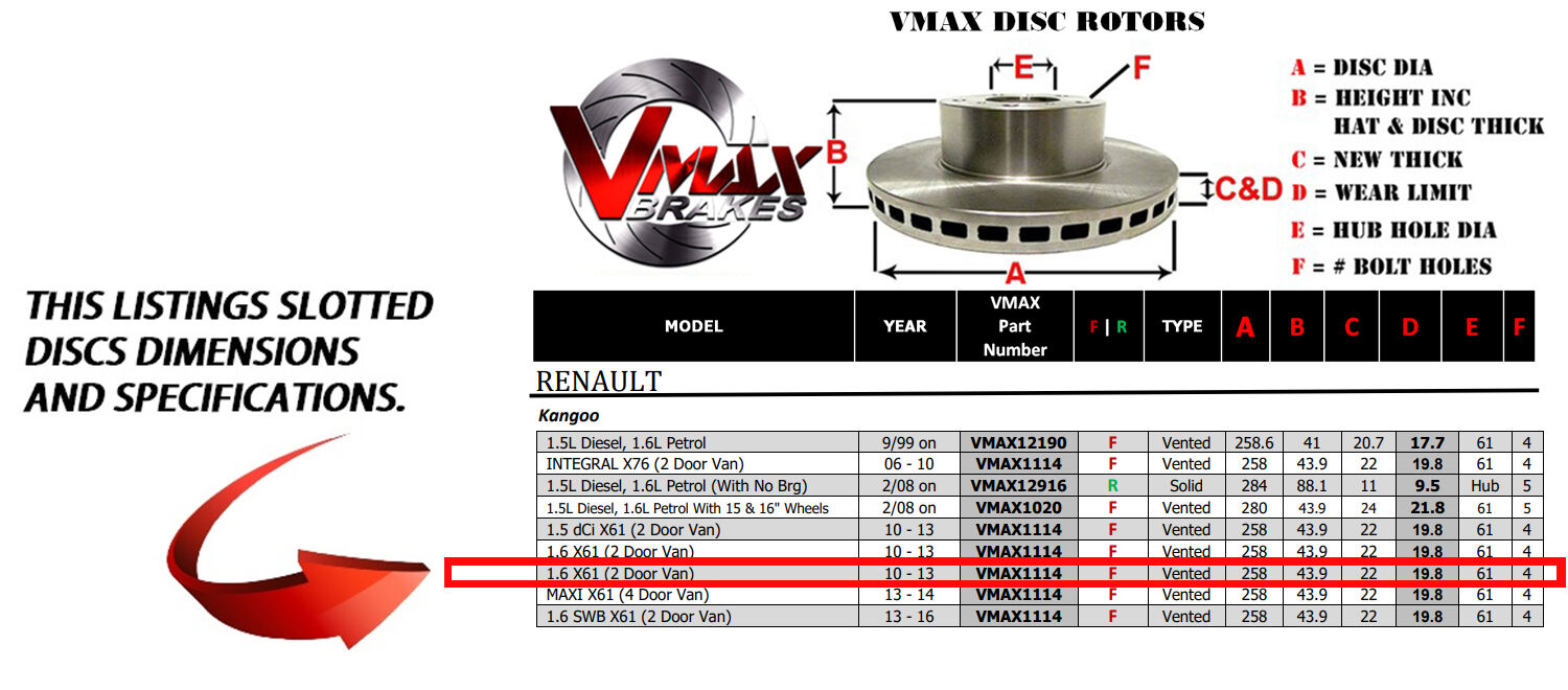 This sale is for a new pair (2 disc rotors) of Genuine VMAX Dimple Drilled & Slotted Performance Front Disc Brake Rotors to suit RENAULT Kangoo 1.6 X61 (2 Door Van) models built 2010 till 2013 and are a direct replacement item.