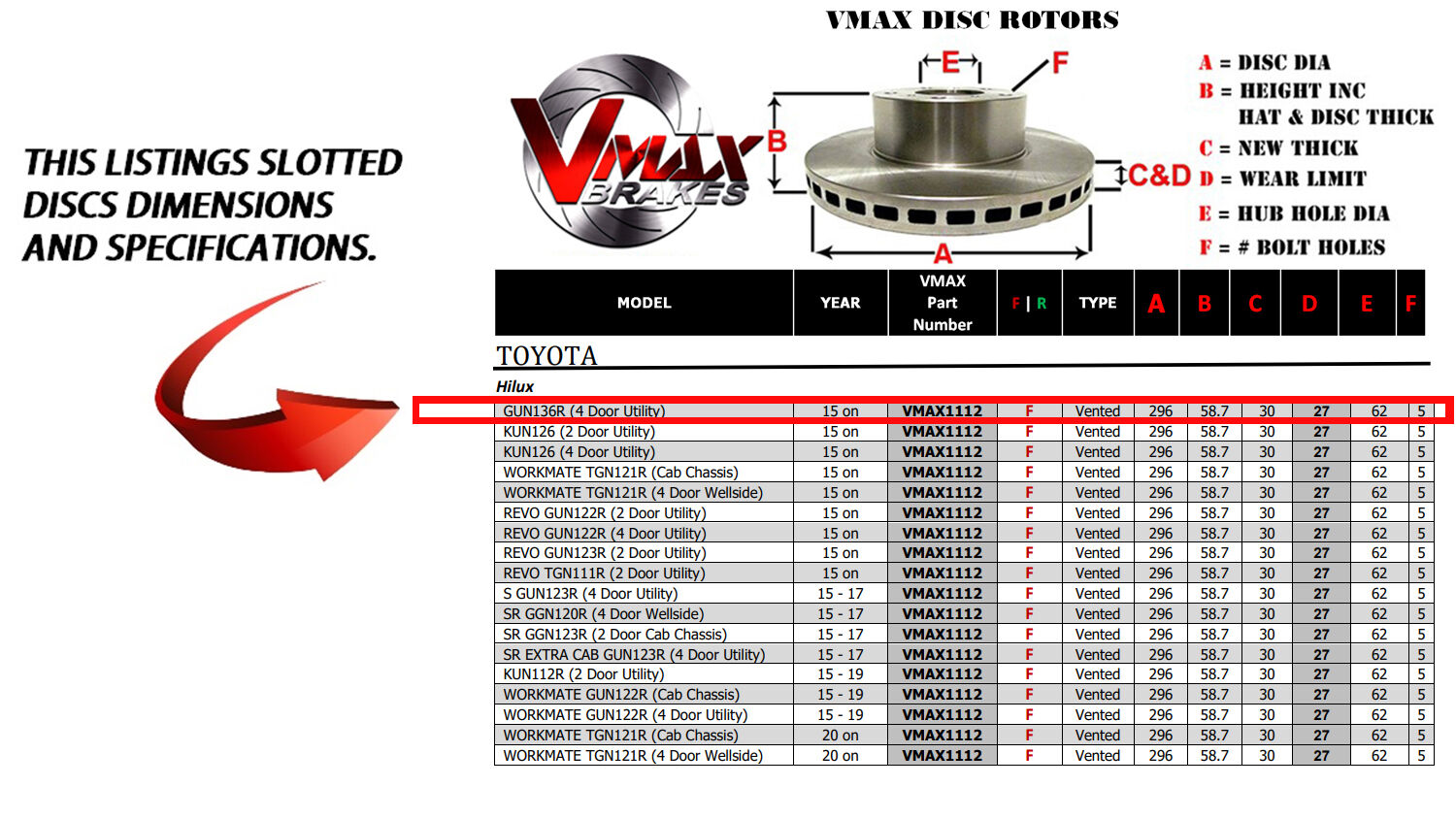 This sale is for a new pair (2 disc rotors) of Genuine VMAX Dimple Drilled & Slotted Performance Front Disc Brake Rotors to suit TOYOTA Hilux GUN136R (4 Door Utility) models built 2015 Onwards and are a direct replacement item.