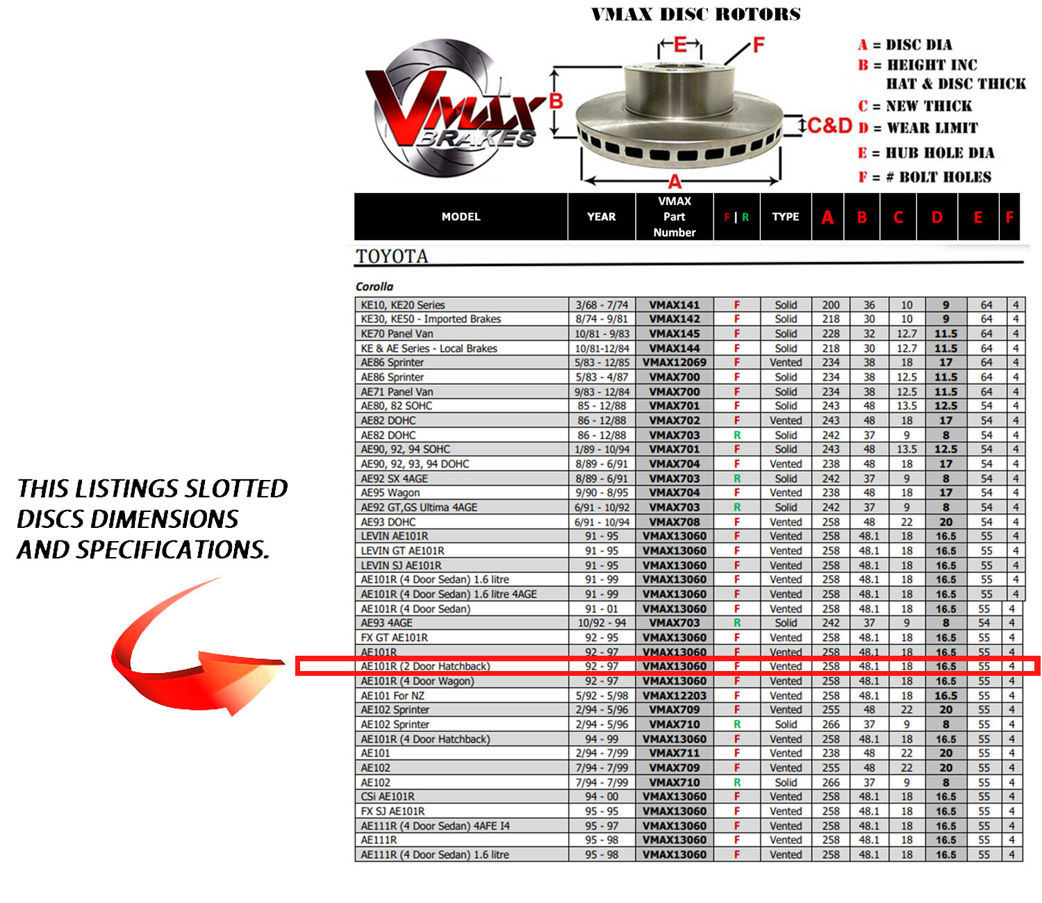 This sale is for a new pair (2 disc rotors) of Genuine VMAX Dimple Drilled & Slotted Performance Front disc brake rotors to suit TOYOTA Corolla AE101R (2 Door Hatchback) models built 1992-1997 and are a direct replacement item.