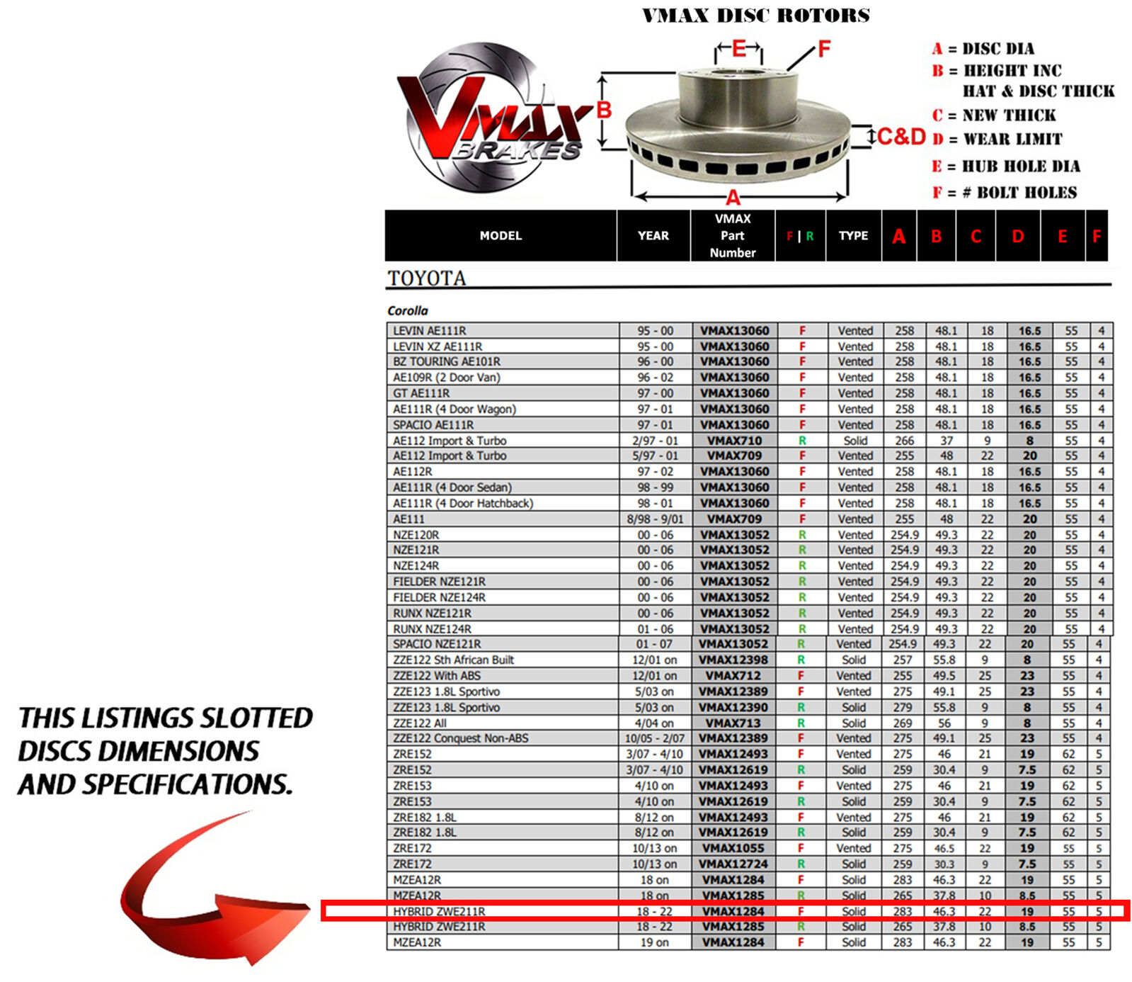 This sale is for a new pair (2 disc rotors) of Genuine VMAX Dimple Drilled & Slotted Performance Front disc brake rotors to suit TOYOTA Corolla HYBRID ZWE211R models built 2018-2022 and are a direct replacement item.