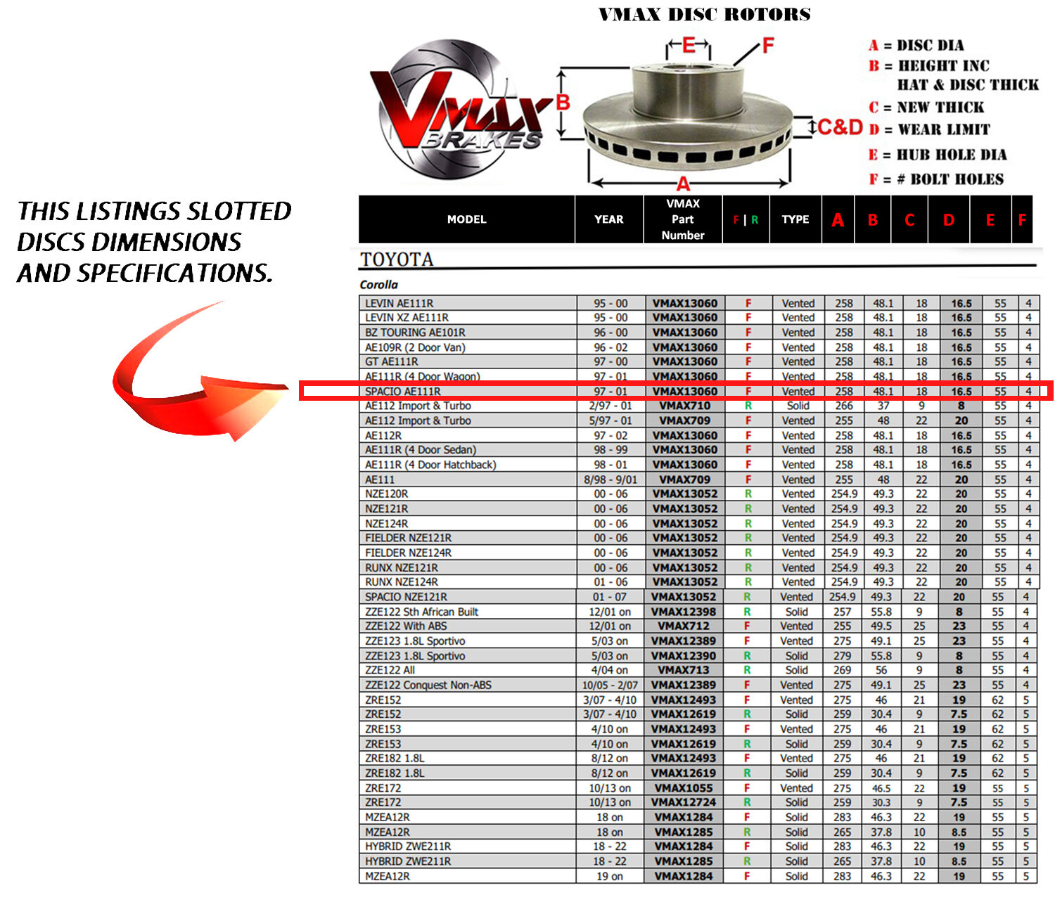 This sale is for a new pair (2 disc rotors) of Genuine VMAX Dimple Drilled & Slotted Performance Front disc brake rotors to suit TOYOTA Corolla SPACIO AE111R models built 1997-2001 and are a direct replacement item.