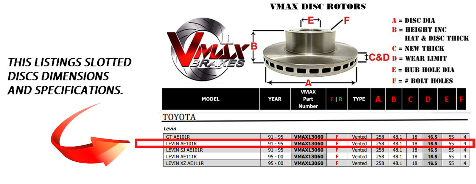 This sale is for a new pair (2 disc rotors) of Genuine VMAX Dimple Drilled & Slotted Performance Front disc brake rotors to suit TOYOTA Levin LEVIN AE101R models built 1991-1995 and are a direct replacement item.