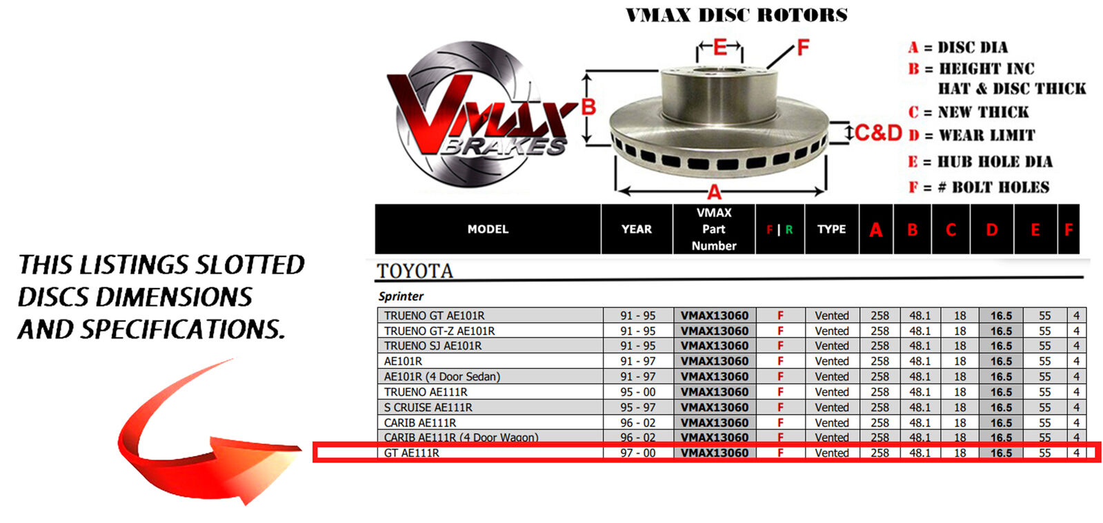 This sale is for a new pair (2 disc rotors) of Genuine VMAX Dimple Drilled & Slotted Performance Front disc brake rotors to suit TOYOTA Sprinter GT AE111R models built 1997-2000 and are a direct replacement item.