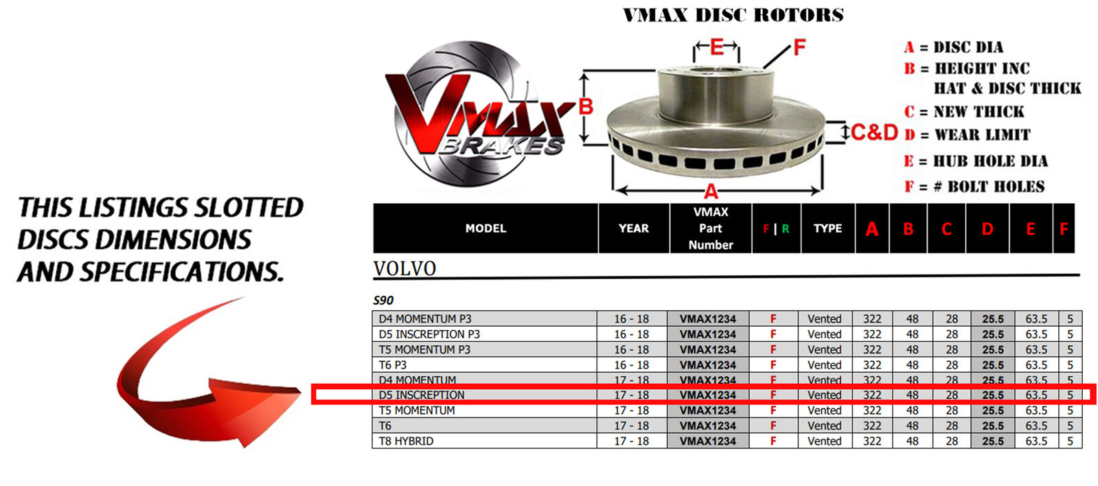 This sale is for a new pair (2 disc rotors) of Genuine VMAX Dimple Drilled & Slotted Performance Front Disc Brake Rotors to suit VOLVO S90 D5 INSCREPTION models built 2017 till 2018 and are a direct replacement item.