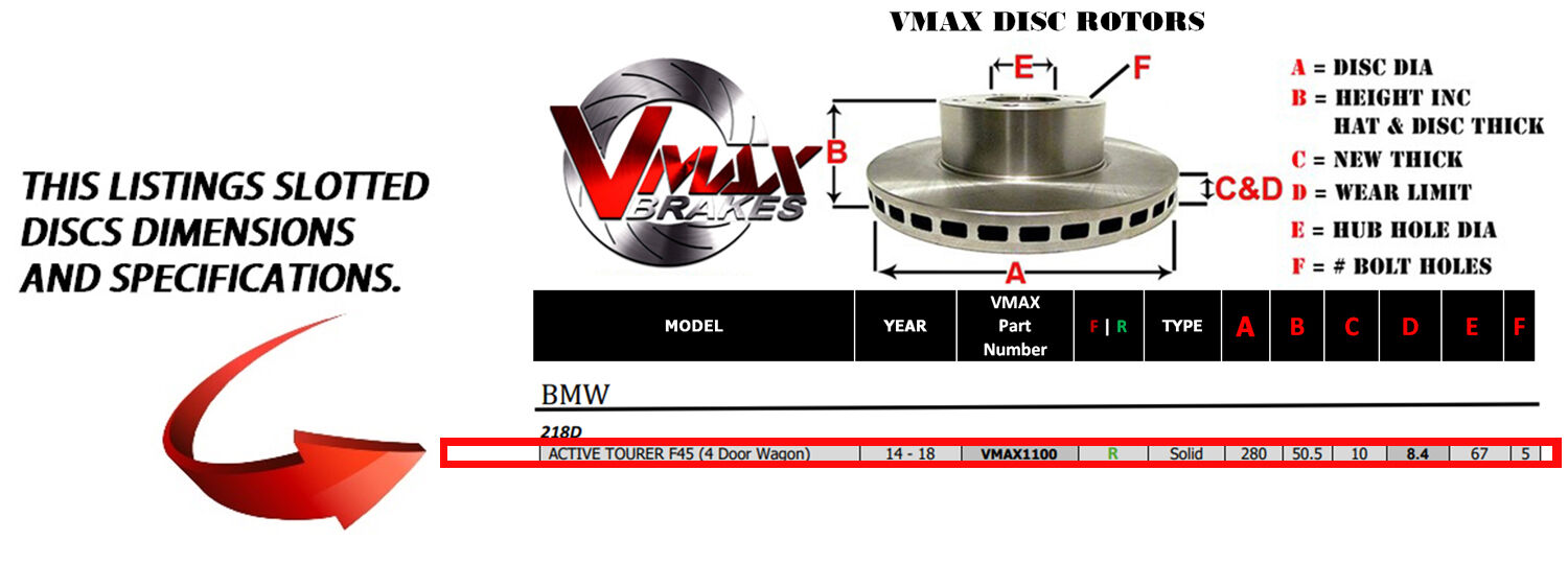 This sale is for a new pair (2 disc rotors) of Genuine VMAX Dimple Drilled & Slotted Performance Rear Disc Brake Rotors and a matching Rear set of brake pads to suit BMW 218D ACTIVE TOURER F45 (4 Door Wagon) models built 2014 till 2018 and are a direct replacement item.
