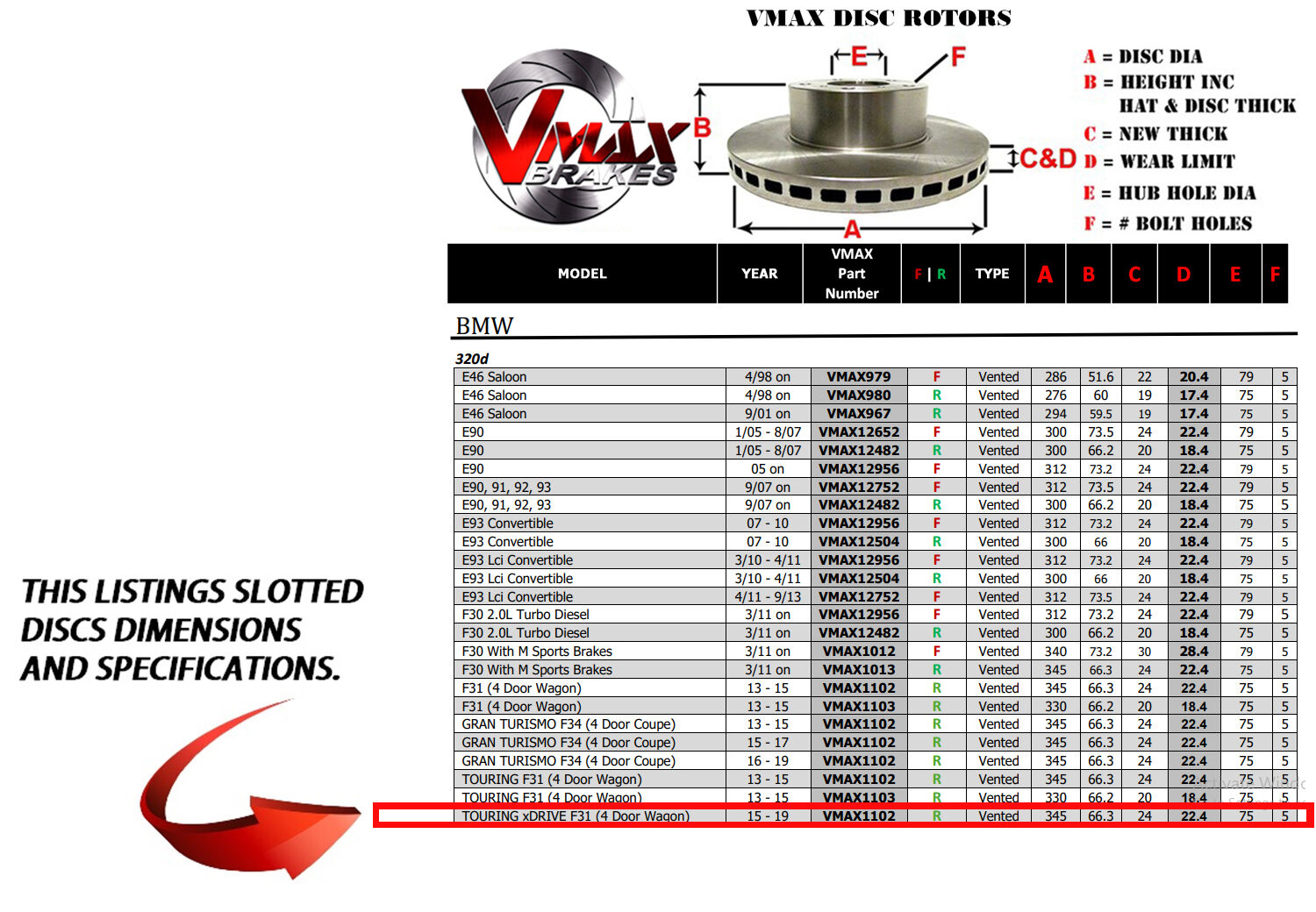 This sale is for a new pair (2 disc rotors) of Genuine VMAX Dimple Drilled & Slotted Performance Rear disc brake rotors and a matching Rear set of brake pads to suit BMW 320d TOURING xDRIVE F31 (4 Door Wagon) models built 2015 till 2019 and are a direct replacement item.