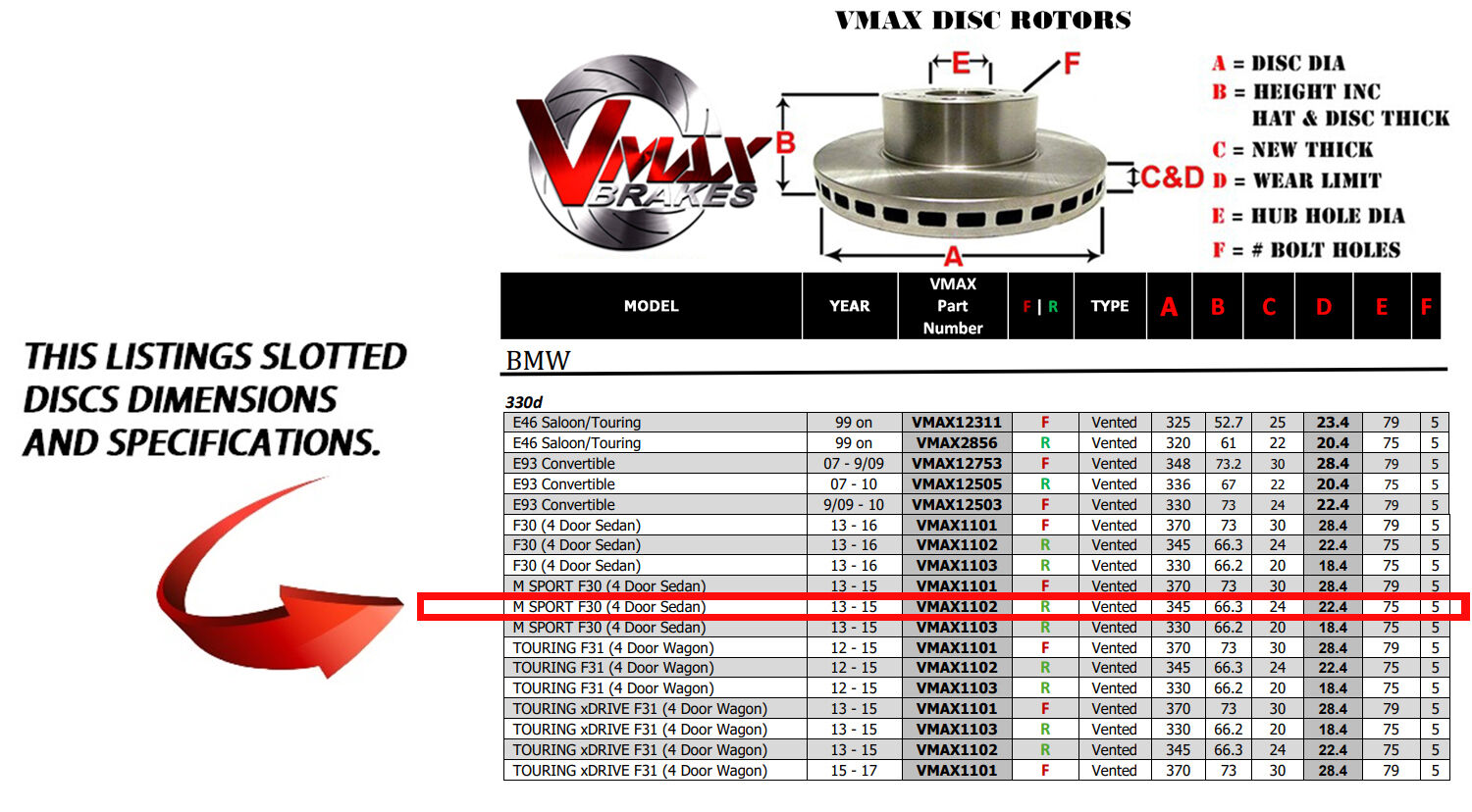 This sale is for a new pair (2 disc rotors) of Genuine VMAX Dimple Drilled & Slotted Performance Rear disc brake rotors and a matching Rear set of brake pads to suit BMW 330d M SPORT F30 (4 Door Sedan) models built 2013 till 2015 and are a direct replacement item.