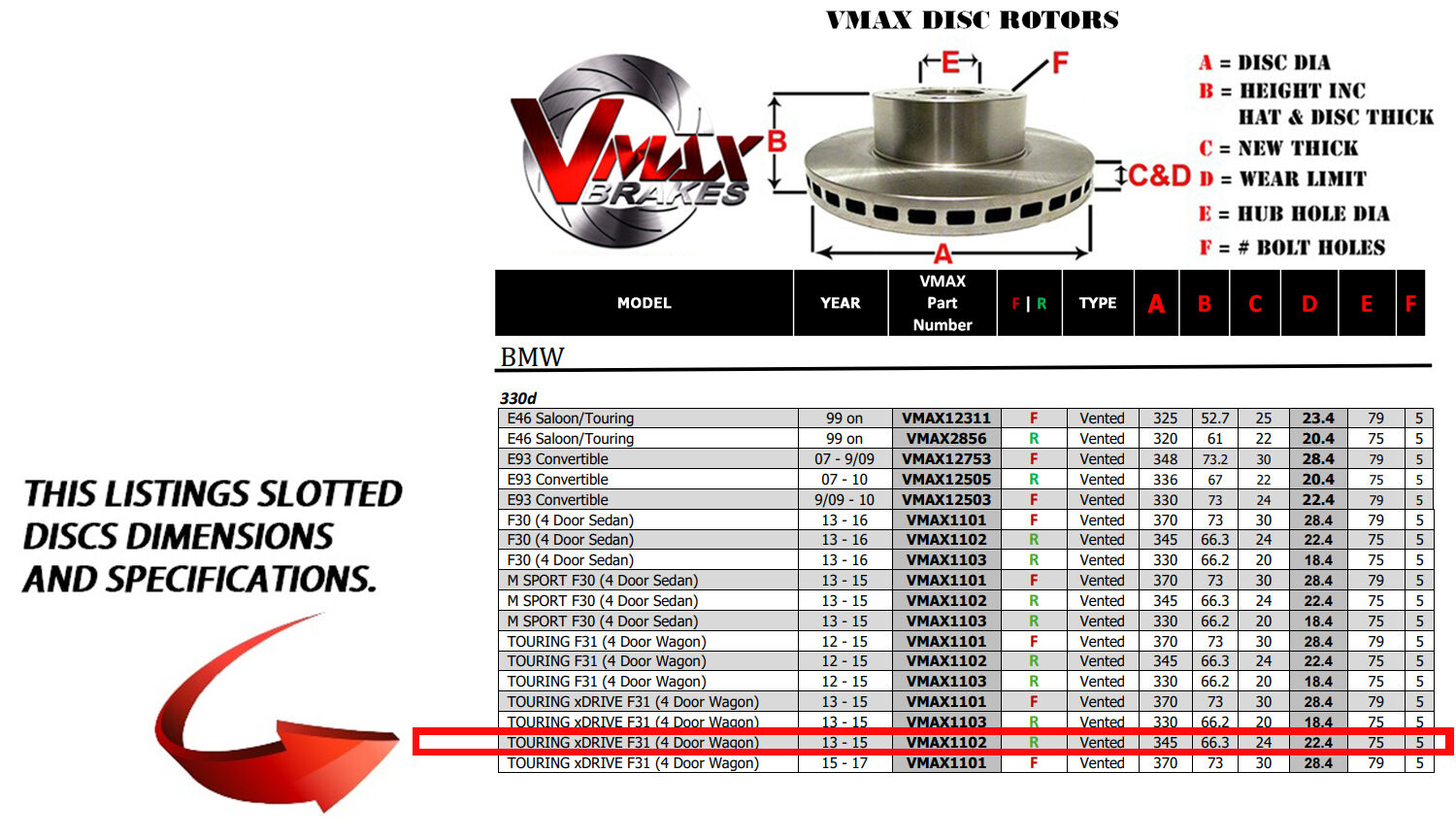 This sale is for a new pair (2 disc rotors) of Genuine VMAX Dimple Drilled & Slotted Performance Rear disc brake rotors and a matching Rear set of brake pads to suit BMW 330d TOURING xDRIVE F31 (4 Door Wagon) models built 2013 till 2015 and are a direct replacement item.