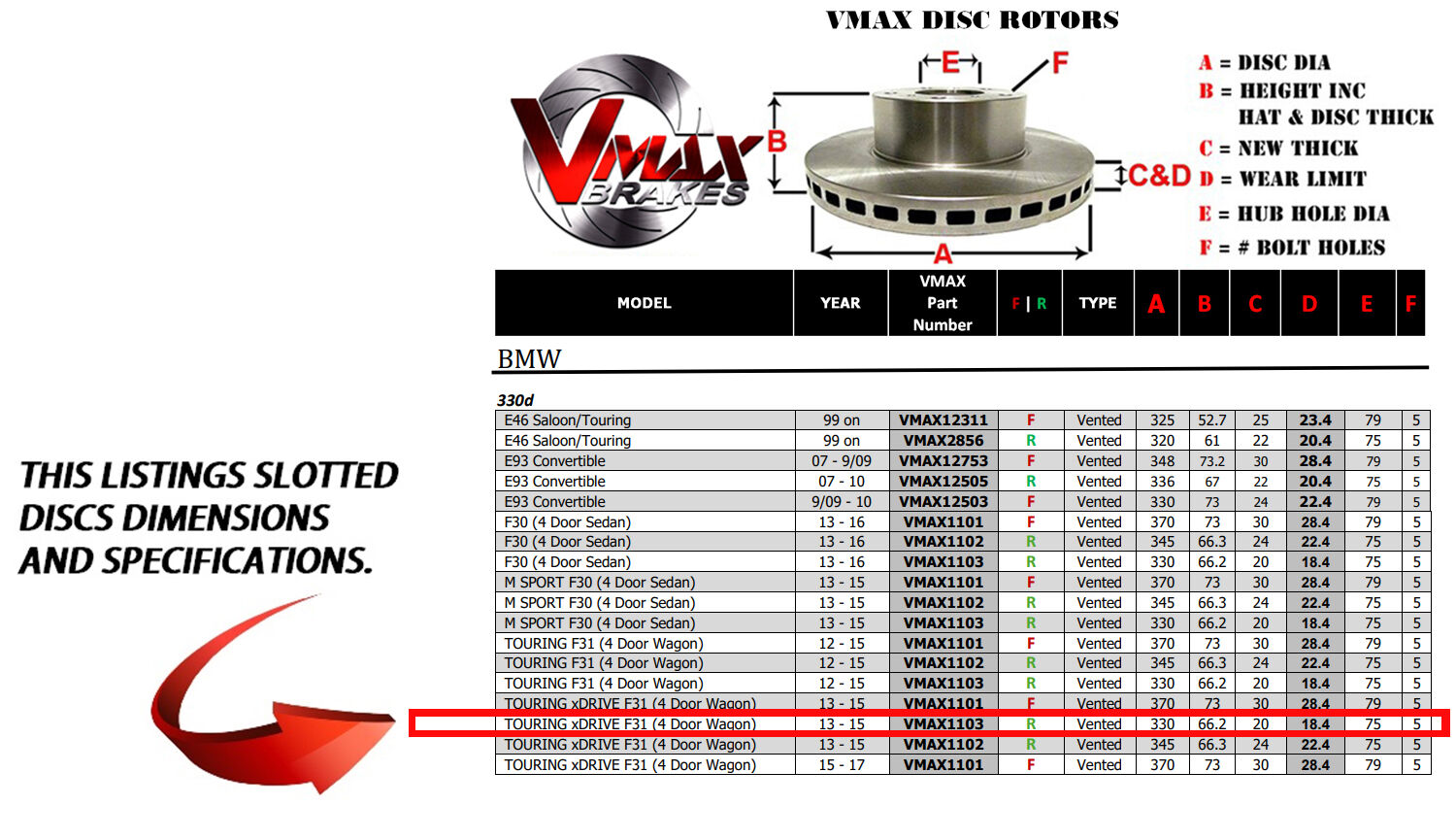 This sale is for a new pair (2 disc rotors) of Genuine VMAX Dimple Drilled & Slotted Performance Rear Disc Brake Rotors and a matching Rear set of brake pads to suit BMW 330d TOURING xDRIVE F31 (4 Door Wagon) models built 2013 till 2015 and are a direct replacement item.