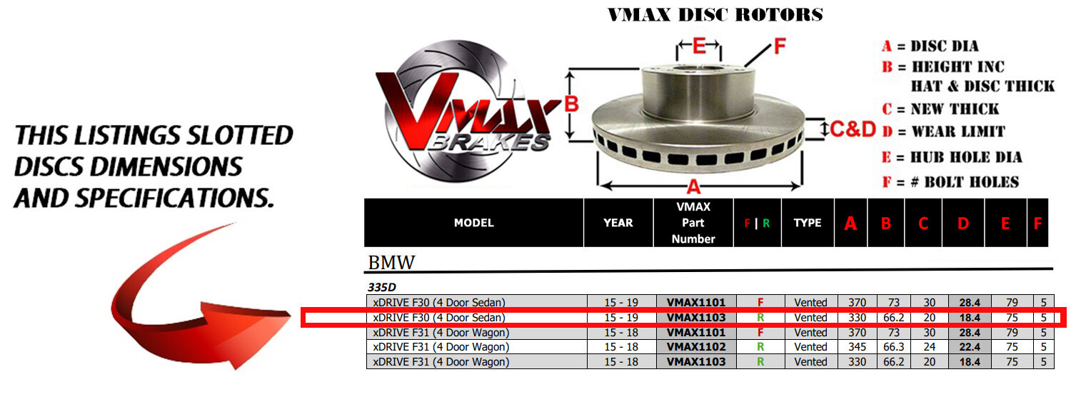 This sale is for a new pair (2 disc rotors) of Genuine VMAX Dimple Drilled & Slotted Performance Rear Disc Brake Rotors and a matching Rear set of brake pads to suit BMW 335D xDRIVE F30 (4 Door Sedan) models built 2015 till 2019 and are a direct replacement item.