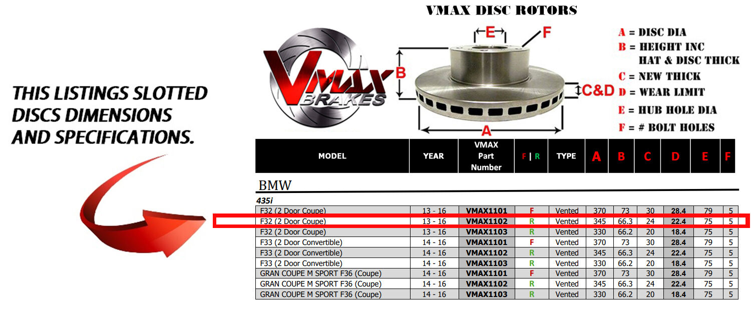 This sale is for a new pair (2 disc rotors) of Genuine VMAX Dimple Drilled & Slotted Performance Rear disc brake rotors and a matching Rear set of brake pads to suit BMW 435i F32 (2 Door Coupe) models built 2013 till 2016 and are a direct replacement item.