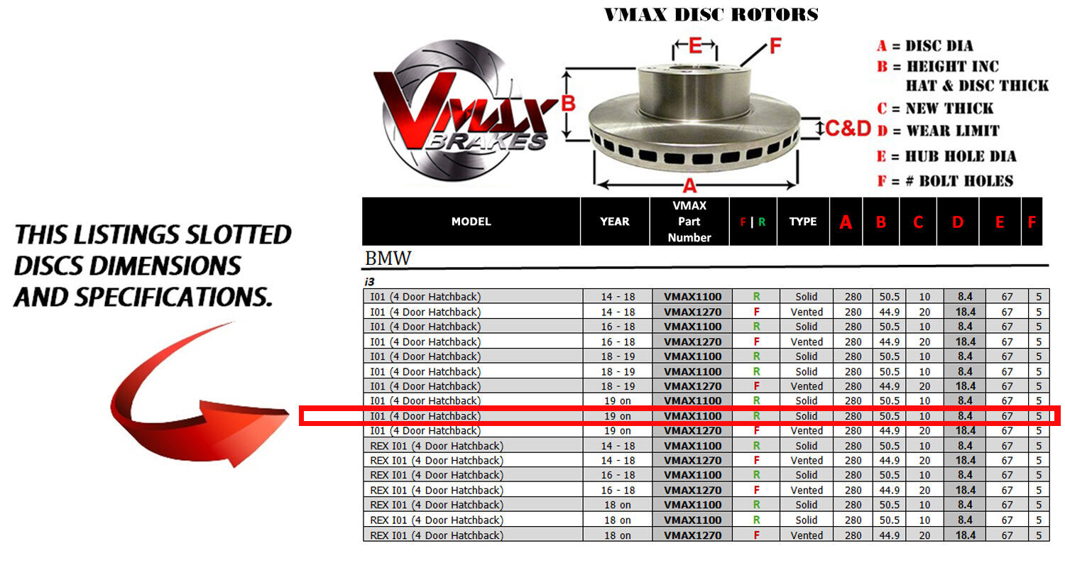 This sale is for a new pair (2 disc rotors) of Genuine VMAX Dimple Drilled & Slotted Performance Rear Disc Brake Rotors and a matching Rear set of brake pads to suit BMW i3 I01 (4 Door Hatchback) models built 2019 Onwards and are a direct replacement item.
