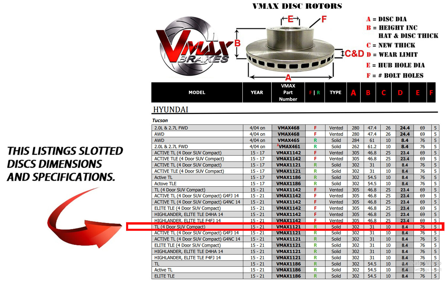 This sale is for a new pair (2 disc rotors) of Genuine VMAX Dimple Drilled & Slotted Performance Rear Disc Brake Rotors and a matching Rear set of brake pads to suit HYUNDAI Tucson TL (4 Door SUV Compact) models built 2015 till 2021 and are a direct replacement item.