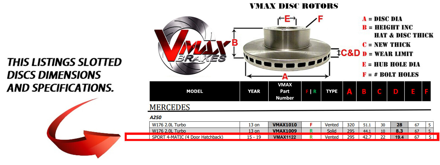 This sale is for a new pair (2 disc rotors) of Genuine VMAX Dimple Drilled & Slotted Performance Rear Disc Brake Rotors and a matching Rear set of brake pads to suit MERCEDES A250 SPORT 4-MATIC (4 Door Hatchback) models built 2015 till 2019 and are a direct replacement item.