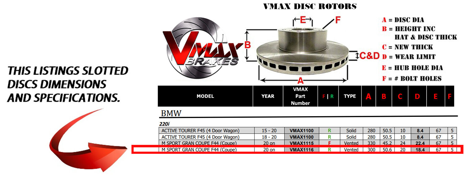 This sale is for a new pair (2 disc rotors) of Genuine VMAX Dimple Drilled & Slotted Performance Rear Disc Brake Rotors to suit BMW 220i M SPORT GRAN COUPE F44 (Coupe) models built 2020 Onwards and are a direct replacement item.