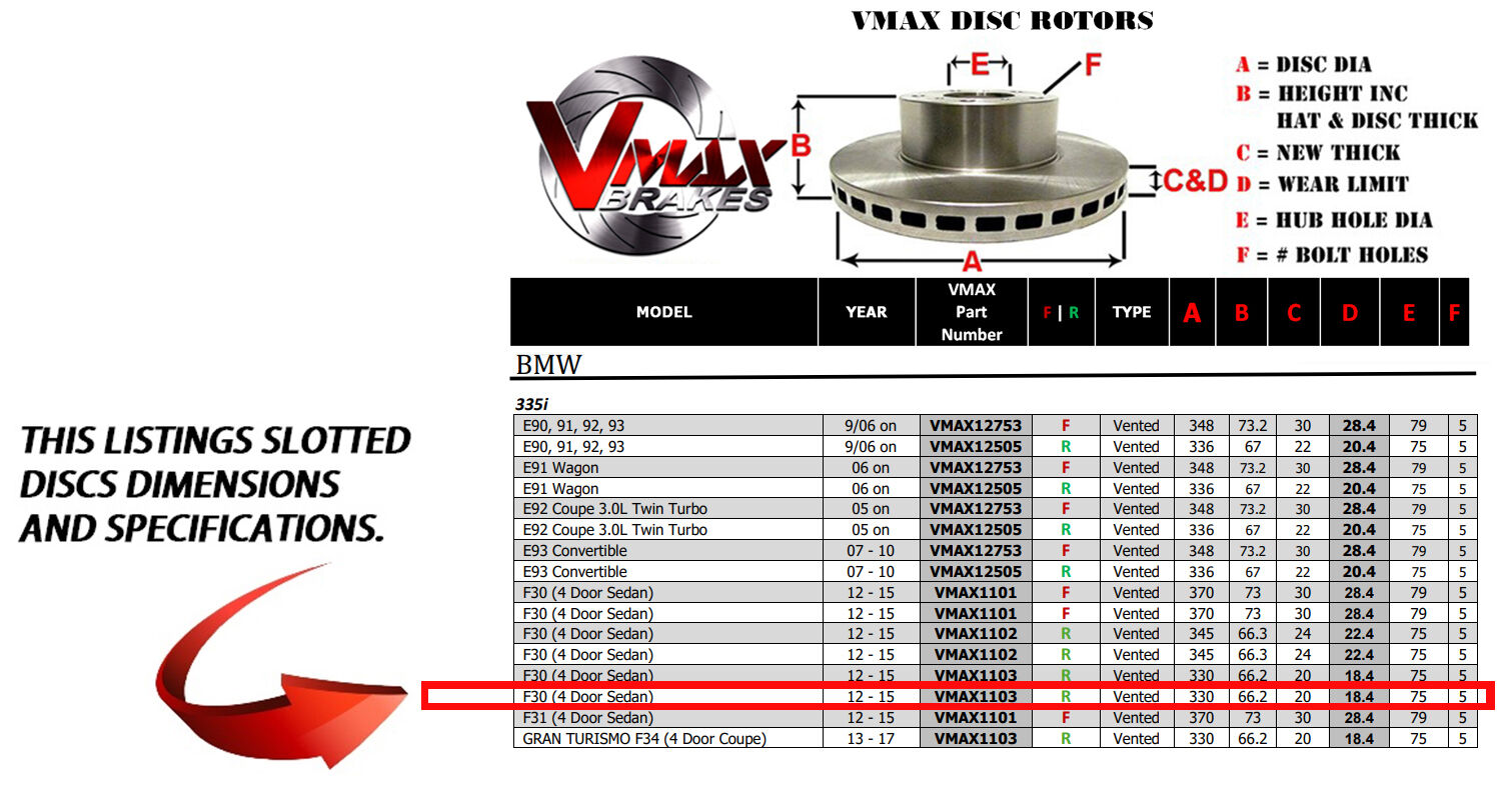 This sale is for a new pair (2 disc rotors) of Genuine VMAX Dimple Drilled & Slotted Performance Rear Disc Brake Rotors to suit BMW 335i F30 (4 Door Sedan) models built 2012 till 2015 and are a direct replacement item.