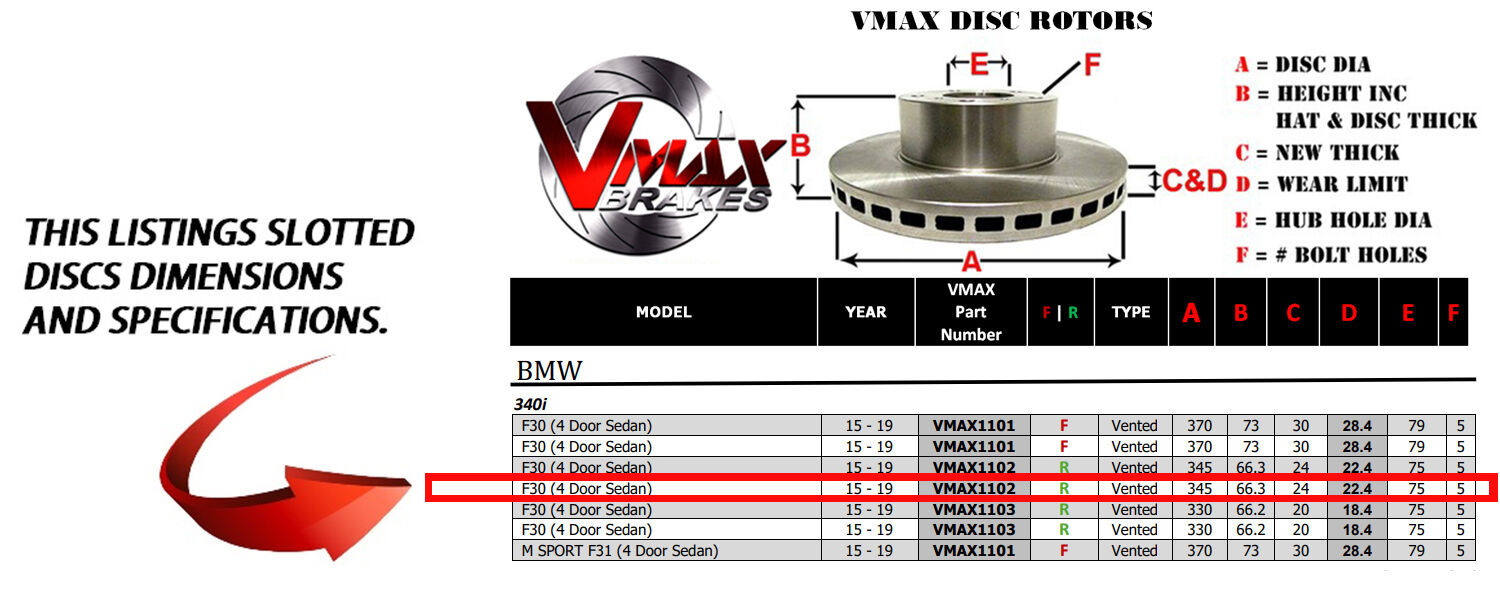 This sale is for a new pair (2 disc rotors) of Genuine VMAX Dimple Drilled & Slotted Performance Rear disc brake rotors to suit BMW 340i F30 (4 Door Sedan) models built 2015 till 2019 and are a direct replacement item.