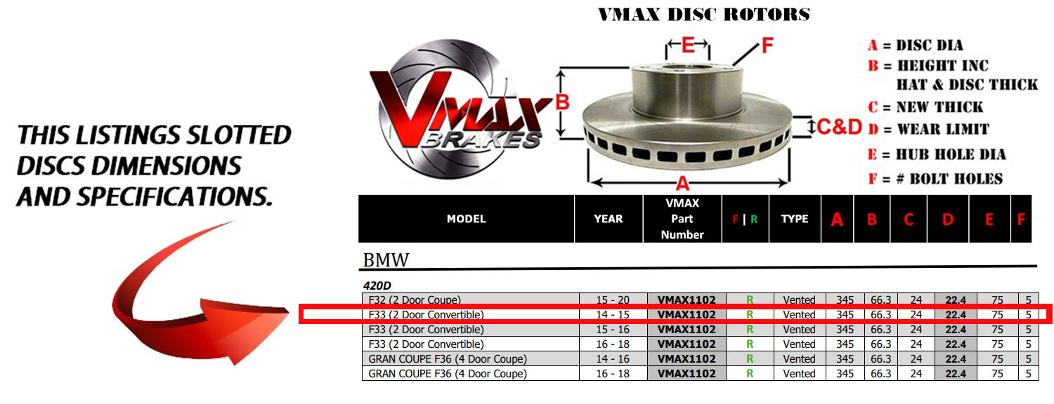 This sale is for a new pair (2 disc rotors) of Genuine VMAX Dimple Drilled & Slotted Performance Rear disc brake rotors to suit BMW 420D F33 (2 Door Convertible) models built 2014 till 2015 and are a direct replacement item.