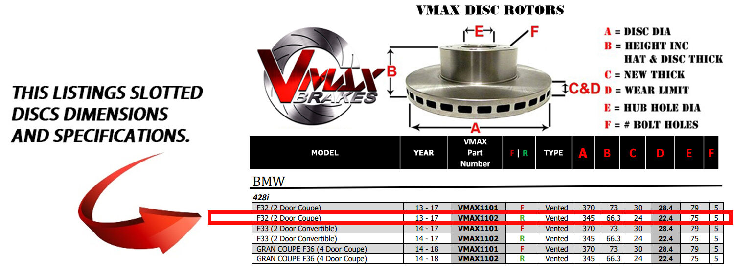 This sale is for a new pair (2 disc rotors) of Genuine VMAX Dimple Drilled & Slotted Performance Rear disc brake rotors to suit BMW 428i F32 (2 Door Coupe) models built 2013 till 2017 and are a direct replacement item.