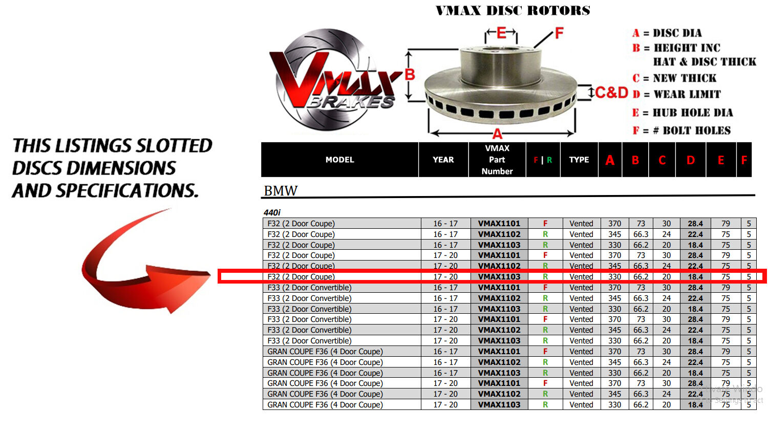 This sale is for a new pair (2 disc rotors) of Genuine VMAX Dimple Drilled & Slotted Performance Rear Disc Brake Rotors to suit BMW 440i F32 (2 Door Coupe) models built 2017 till 2020 and are a direct replacement item.