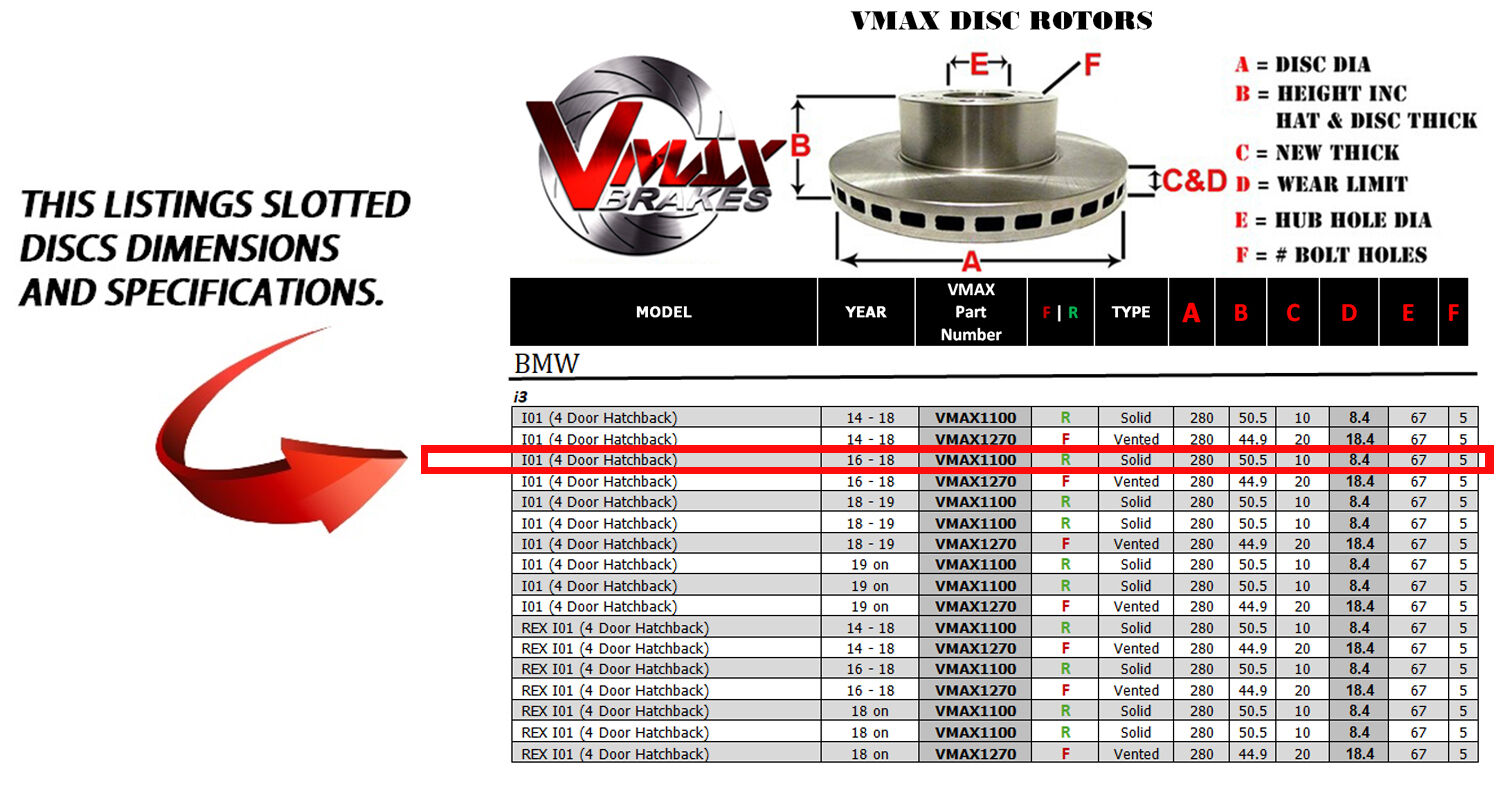 This sale is for a new pair (2 disc rotors) of Genuine VMAX Dimple Drilled & Slotted Performance Rear Disc Brake Rotors to suit BMW i3 I01 (4 Door Hatchback) models built 2016 till 2018 and are a direct replacement item.
