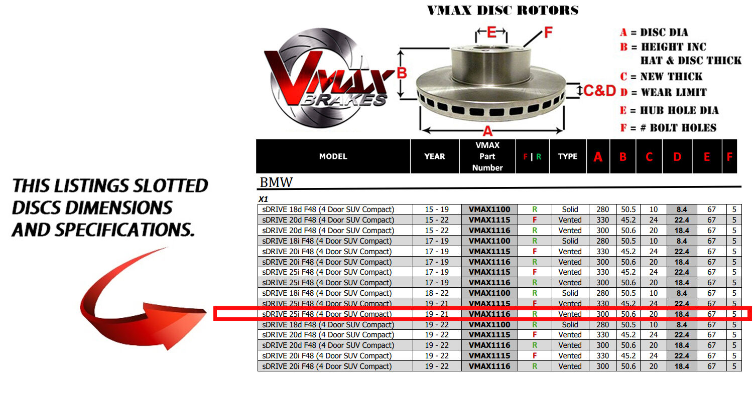 This sale is for a new pair (2 disc rotors) of Genuine VMAX Dimple Drilled & Slotted Performance Rear Disc Brake Rotors to suit BMW X1 sDRIVE 25i F48 (4 Door SUV Compact) models built 2019 till 2021 and are a direct replacement item.